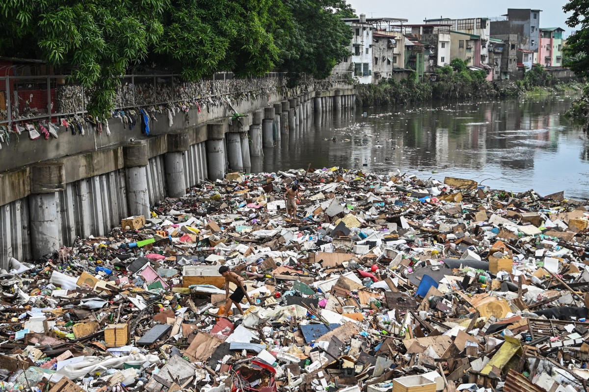 Residents pick up debris in a river in the aftermath of Typhoon Gaemi in Manila on July 25, 2024. (Photo by Jam Sta Rosa / AFP)