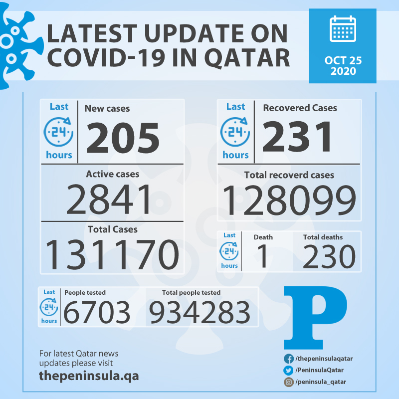 One death and 231 Covid-19 recoveries in Qatar on Oct 25