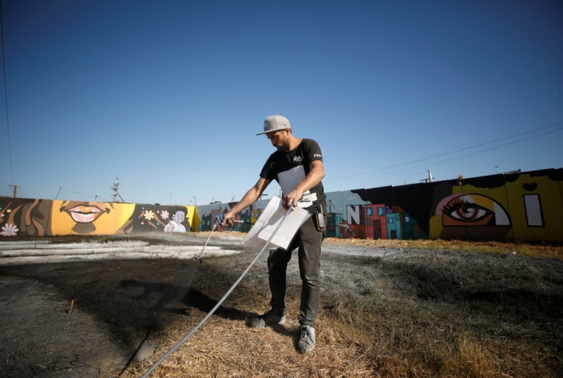 French artist Saype spray-paints a giant fresco on the ground in Sea Point, Cape Town, South Africa, January 18, 2021. Reuters/Mike Hutchings