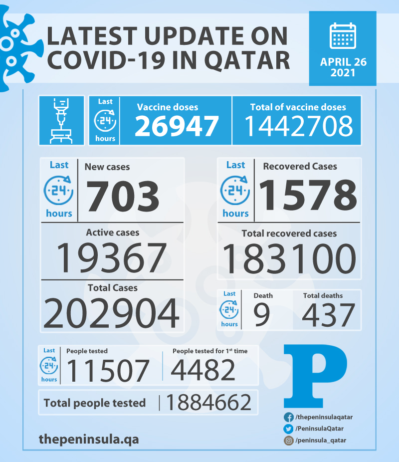Doha: Ministry of Public Health (MoPH) today reported 703 new cases of coronavirus (Covid-19) and 1,578 people recovered from the virus in the last 24 hours, bringing the total number of people recovered in Qatar to 183,100.