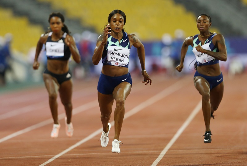 Jamaica’s Thompson-Herah registered her second consecutive win in women’s 100m in as many weeks, clocking 10.87, a little short of her world leading time of 10.85, she set in Rome last week.