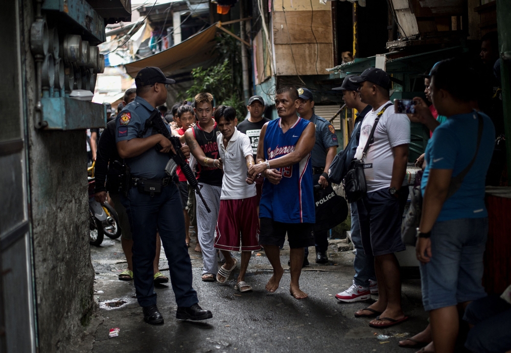 In this file photo taken on July 20, 2017, male residents are rounded up for verification after police officers conducted a large scale anti-drug raid at a slum community in Manila. (Photo by Noel Celis / AFP)
