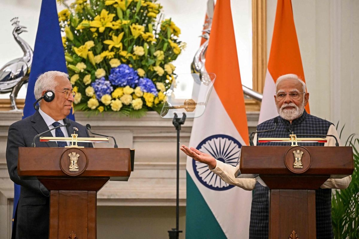 India's Prime Minister Narendra Modi (R) speaks as European Council President Antonio Costa listens during joint press statements after their meeting at the Hyderabad House in New Delhi on January 27, 2026. Photo by Sajjad HUSSAIN / AFP