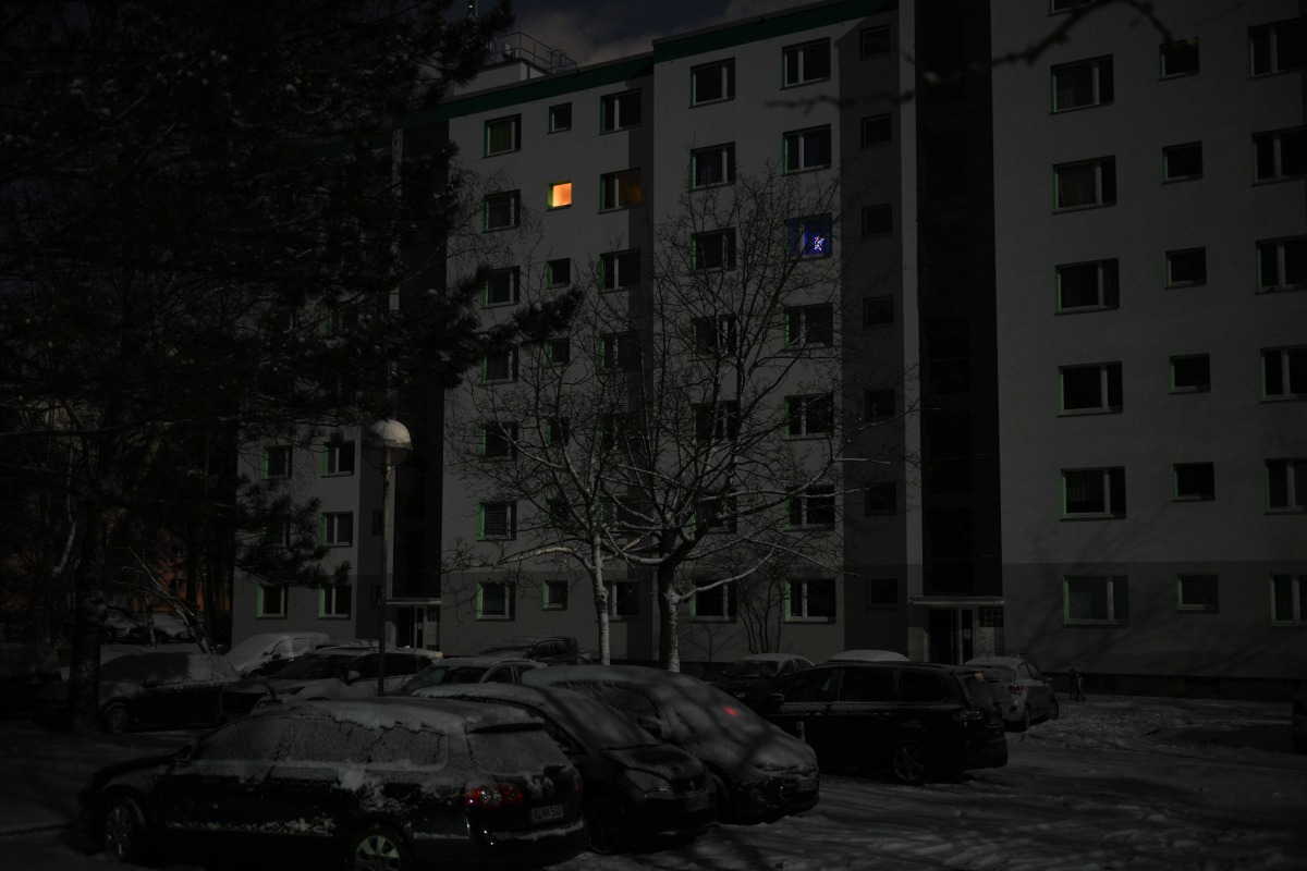 Light is seen through a window of an apartment of a residential building in the Zehlendorf district in southwest Berlin on early January 4, 2026, after power cables in the area were seriously damaged causing a power outage which left tens of thousands of households in the German capital without electricity. Photo by RALF HIRSCHBERGER / AFP