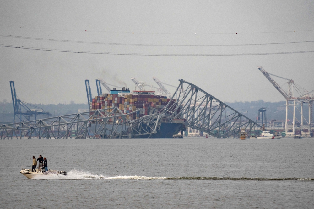 Part of the steel frame of the Francis Scott Key Bridge sits on top of the container ship Dali after the bridge collapsed in Baltimore, Maryland, on March 26, 2024. Photo by Kent Nishimura / AFP