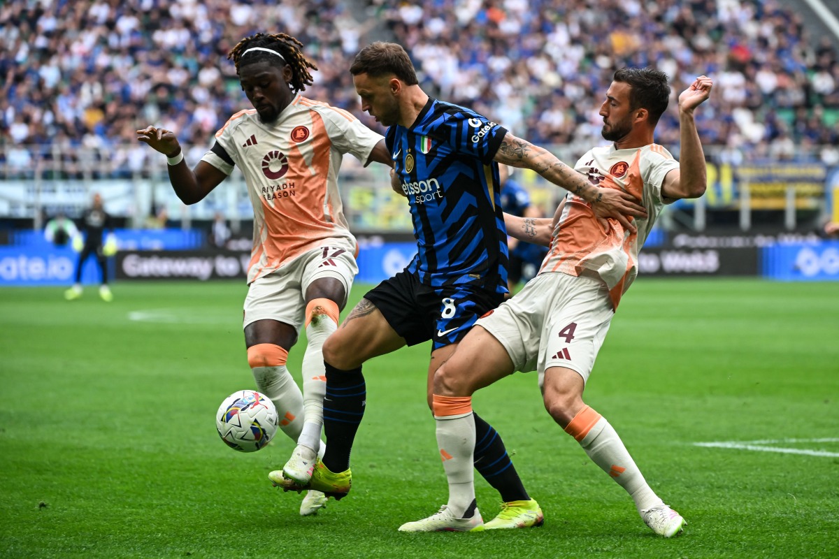 Inter Milan's Austrian forward #08 Marko Arnautovic fights for the ball with Roma's French midfielder #17 Manu Kone and Roma's Italian midfielder #4 Bryan Cristante during the Italian Serie A football match between Inter Milan and Roma at the San Siro stadium in Milan on April 27, 2025. (Photo by Piero CRUCIATTI / AFP)