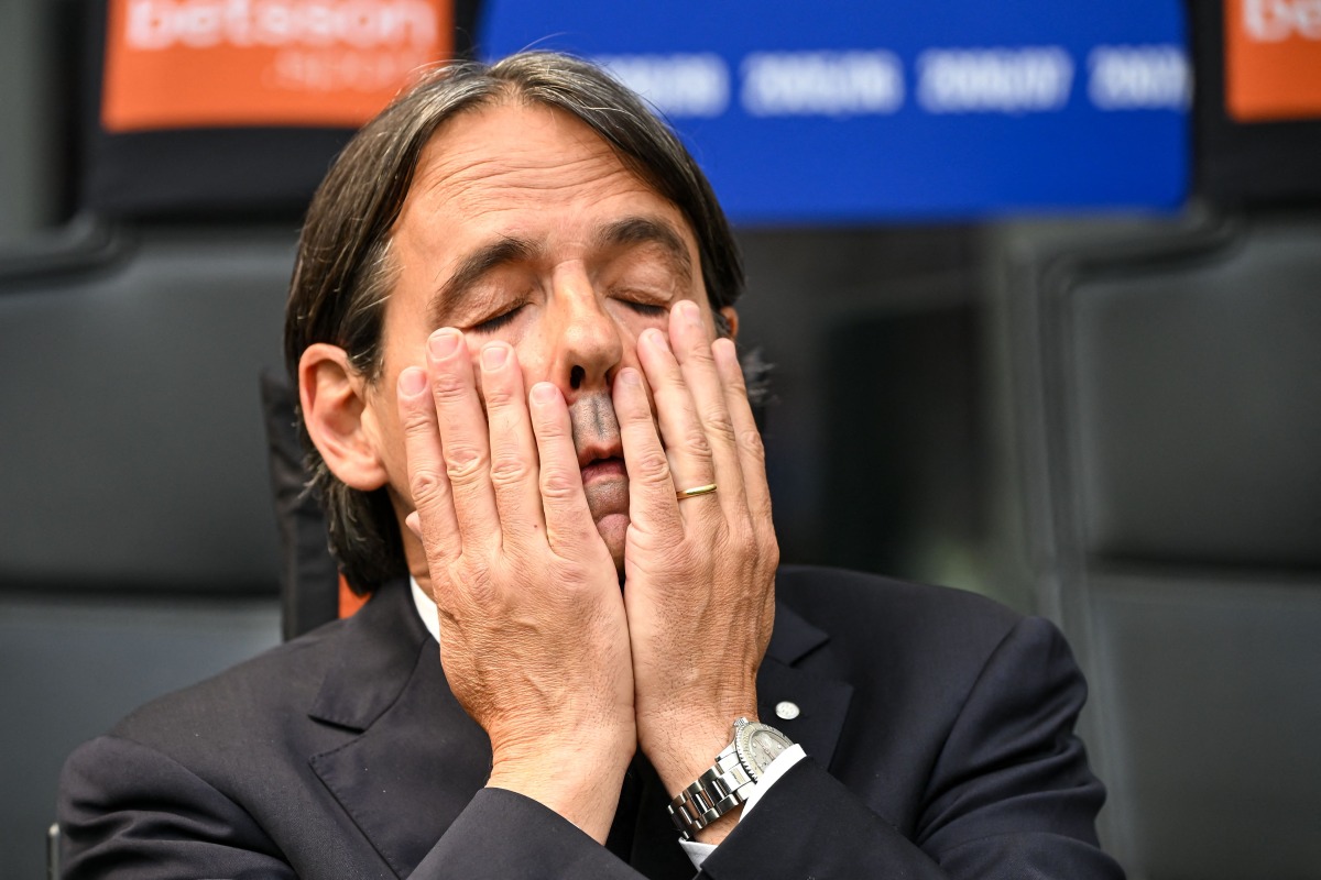 Inter Milan's Italian coach Simone Inzaghi reacts before the Italian Serie A football match between Inter Milan and Roma at the San Siro stadium in Milan on April 27, 2025. (Photo by Piero CRUCIATTI / AFP)