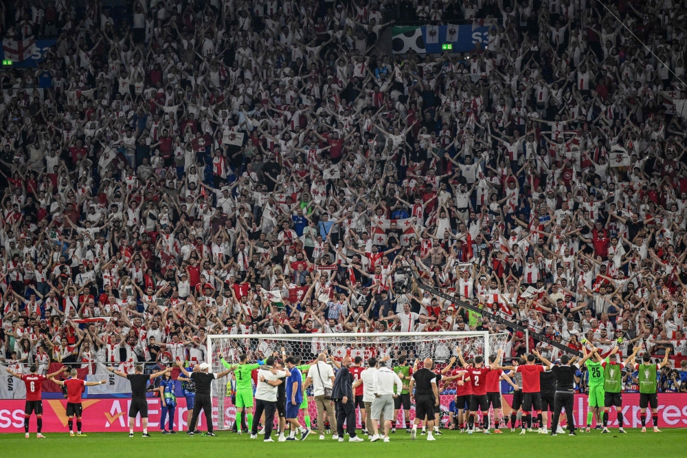 Georgia's players cheer their supporters after they won the UEFA Euro 2024 Group F football match between Georgia and Portugal at the Arena AufSchalke in Gelsenkirchen on June 26, 2024. (Photo by Ina Fassbender / AFP)