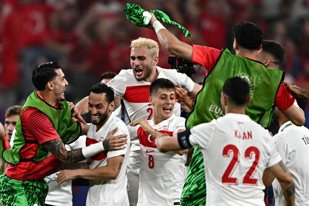 Turkiye's players celebrate qualifying for the knock-out stages at the end of the UEFA Euro 2024 Group F football match between the Czech Republic and Turkiye at the Volksparkstadion in Hamburg on June 26, 2024. (Photo by Gabriel Bouys / AFP)