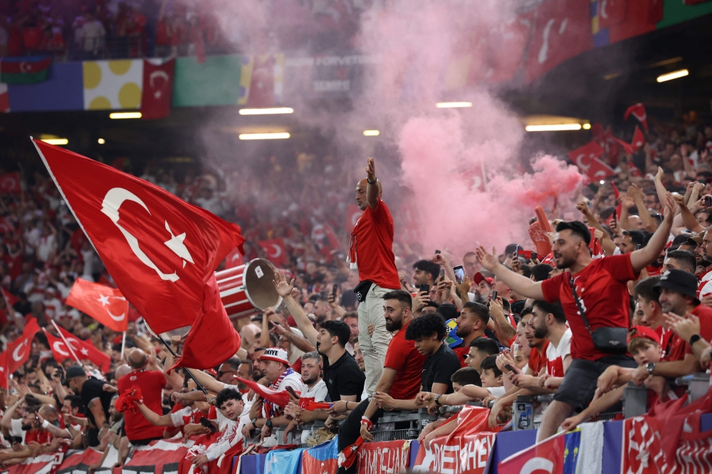 Turkiye supporters celebrate at the end of the UEFA Euro 2024 Group F football match between the Czech Republic and Turkiye at the Volksparkstadion in Hamburg on June 26, 2024. (Photo by Ronny Hartmann / AFP)