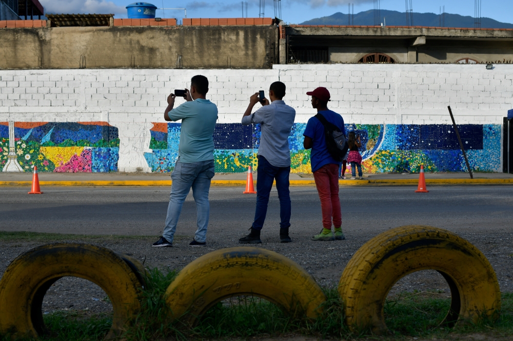 People take photographs of an eco-mural made with bottle caps to raise awareness for recycling, in Caracas, Venezuela August 19, 2022. Reuters/Gaby Oraa