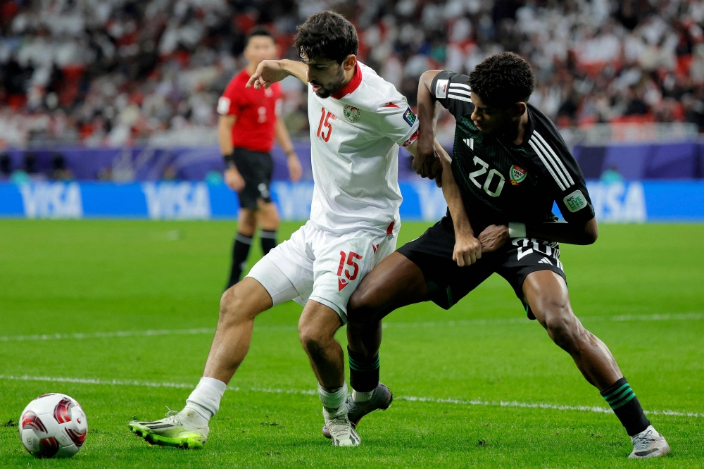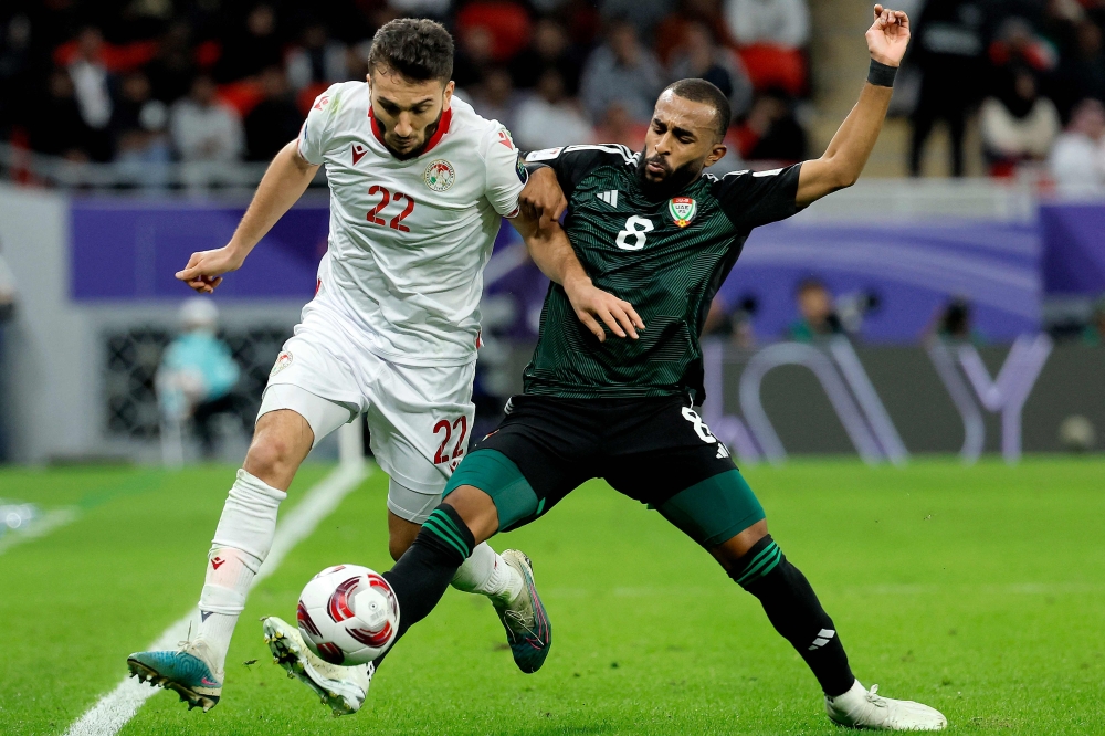 UAE's forward #20 Yahya al-Ghassani vies for the ball against Tajikistan's midfielder #15 Shervoni Mabatshoev during the Qatar 2023 AFC Asian Cup football match between Tajikistan and United Arab Emirates at Ahmad Bin Ali Stadium in Al-Rayyan, west of Doha, on January 28, 2024. (Photo by KARIM JAAFAR / AFP)