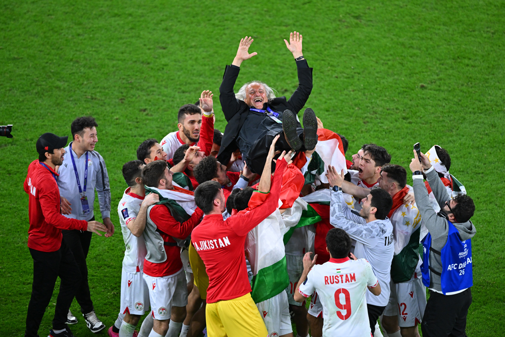 Tajikistan's players toss coach Petar Segrt in the air as they celebrate their memorable victory against UAE.