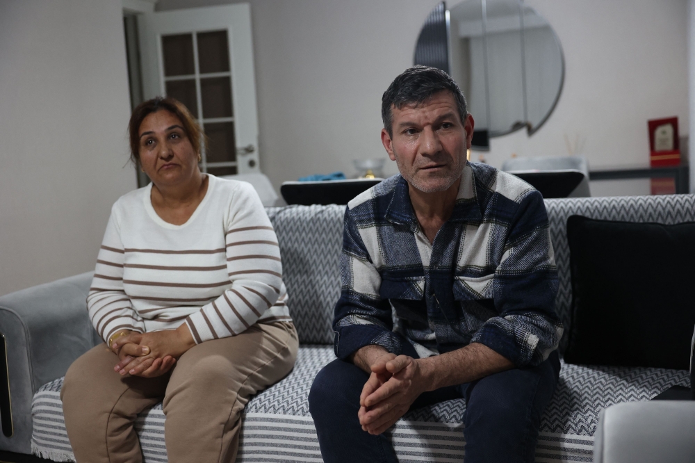 Mesut Hancer (R) and his wife Gulseren Hancer (L) during an interview, in Ankara on January 11, 2024. (Photo by Adem Altan / AFP)