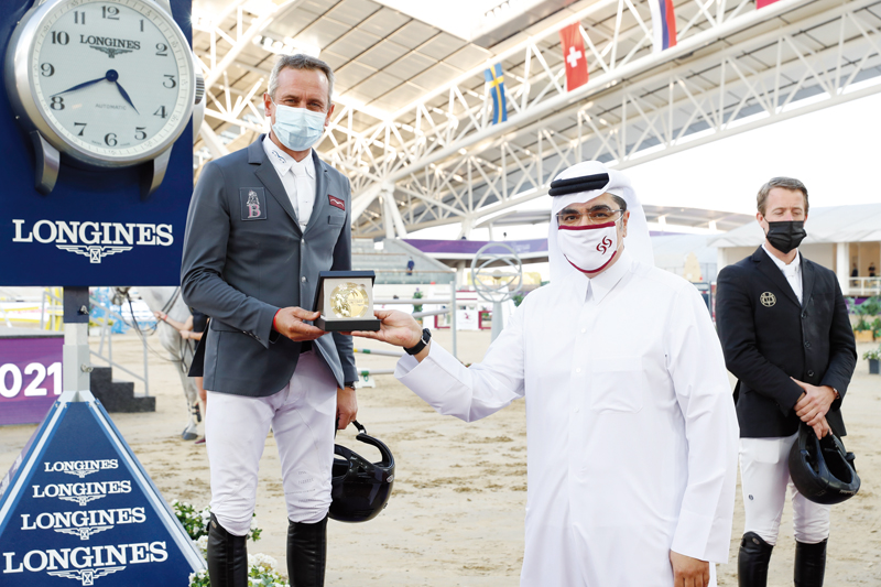 Germany’s Christian Ahlmann, the CHI Al Shaqab Grand Prix winner who captured major honours on the final day of the Commercial Bank CHI Al Shaqab Presented by Longines, receiving his trophy from Event Director and Organising Committee Member Omar Al Mann