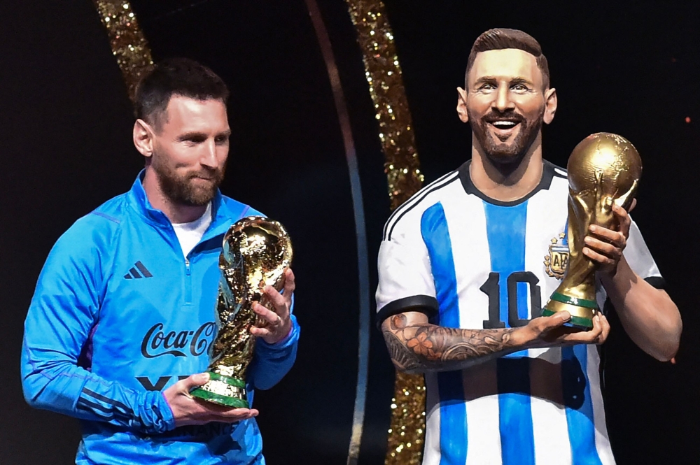 Argentina's forward Lionel Messi stands next to a statue of himself during a tribute by Conmebol to Argentina for their Qatar 2022 World Cup title.