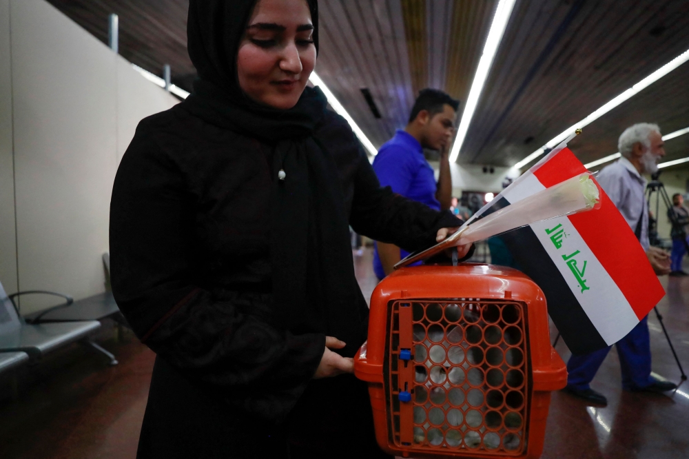 A woman evacuated from Sudan holds her pet cat as she arrives at Baghdad International Airport on April 27, 2023. (Photo by AHMAD AL-RUBAYE / AFP)