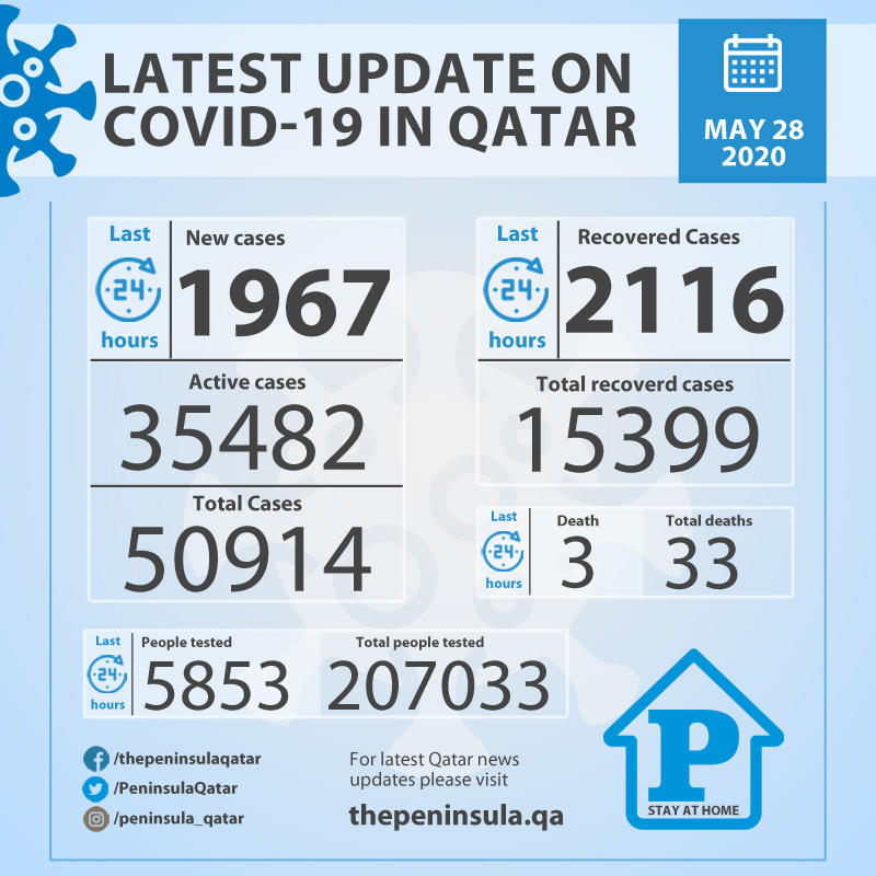 Ministry of Public Health reported 1967 new confirmed cases of Corona virus (Covid-19), and 2116 new recoveries in the last 24 hours, bringing the total number of recoveries in the State of Qatar to 15,399. The Ministry today also announced 3 deaths due to the virus