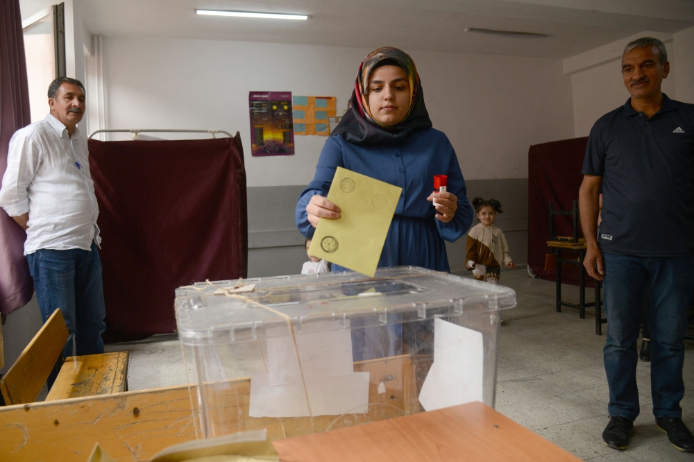 A voter arrives to cast their ballot during the presidential runoff vote in Diyarbakir, on May 28, 2023. Photo by ILYAS AKENGIN / AFP