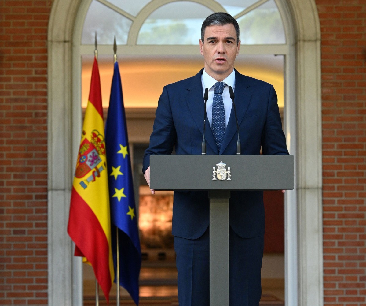 In this handout picture taken and released by La Moncloa on May 28, 2024 Spain's Prime Minister Pedro Sanchez delivers a speech over the recognition of Palestinian statehood by Spain, at La Moncloa Palace in Madrid. (Photo by Borja Puig de la BELLACASA / LA MONCLOA / AFP)