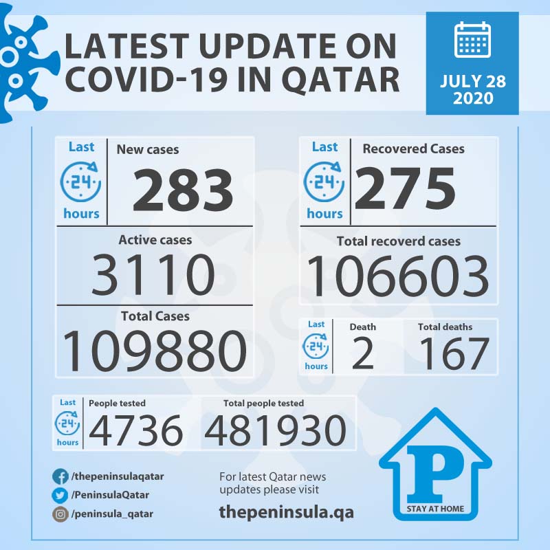 Ministry of Public Health today recorded 283 new cases of coronavirus (COVID-19) and 275 people recovered from the virus in the last 24 hours, bringing the total number of people recovered in Qatar to 106603. The Ministry also announced two deaths due to Covid-19.