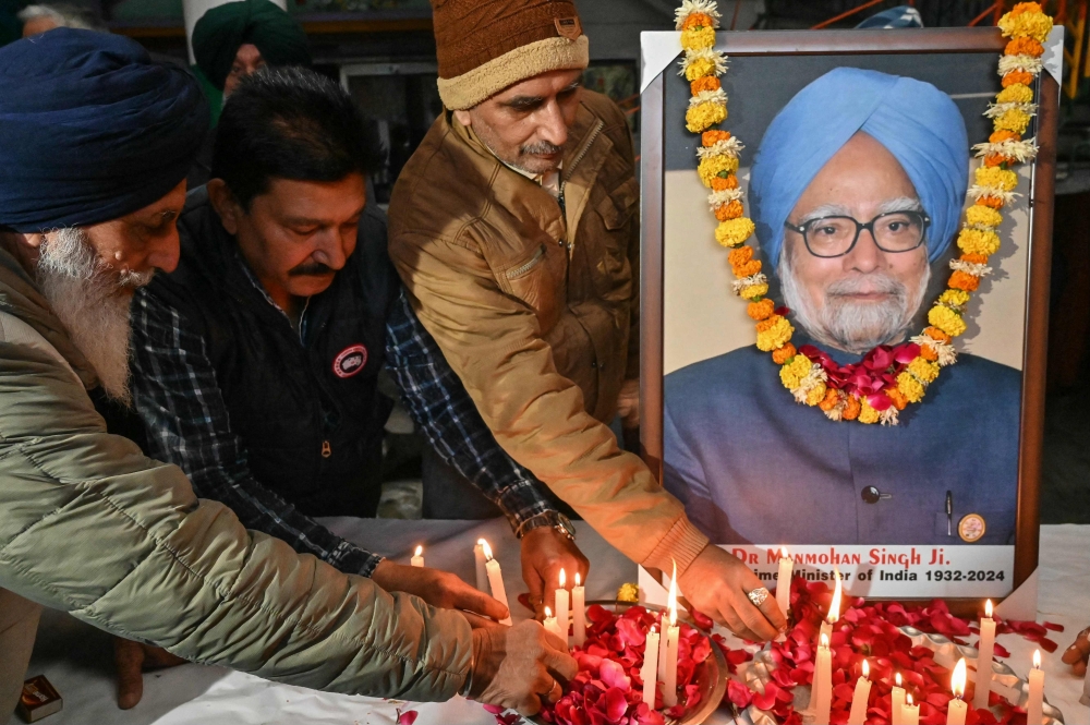 Members of Congress party light candles as they pay homage to late India's former Prime Minister Manmohan Singh on December 27, 2024. (Photo by Narinder Nanu / AFP)