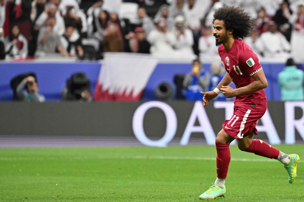 Qatar's Akram Afif celebrates scoring his team's second goal during the AFC Asian Cup Qatar 2023 football match between Qatar and Palestine at Al Bayt Stadium in Al Khor, north of Doha, on January 29, 2024. (Photo by Hector Retamal / AFP)