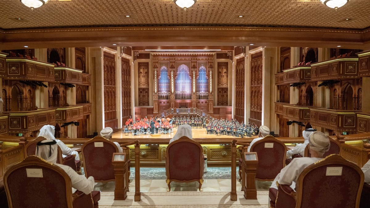 His Highness also listened to an explanation about the design of the Opera House, which was inspired by Omani heritage. He then witnessed a musical performance delivered by a joint ensemble made up of the brass band, military choir, and the steel band, along with performers from the first regiment of the Royal Guard of Oman.
