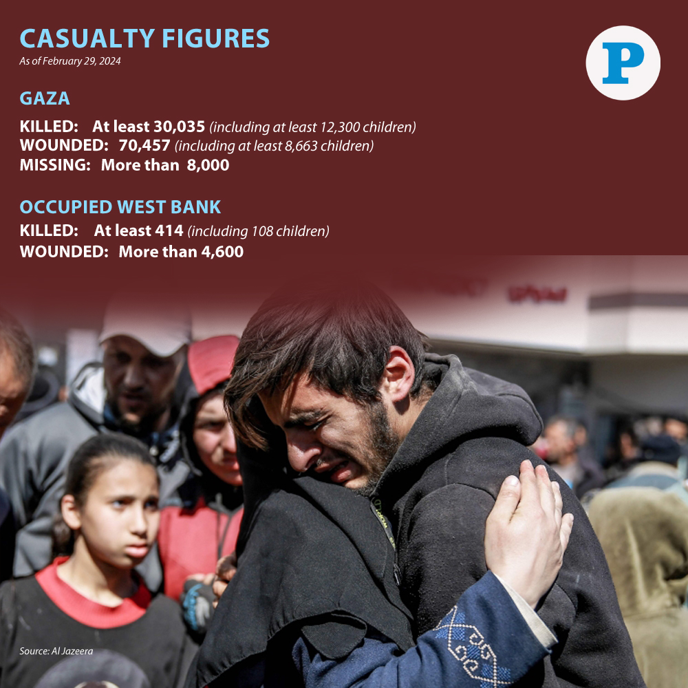[8pm Doha Time] More than 30,000 have been killed in Gaza—that's 1 out every 75 people in the Gaza Strip. Latest report from the Gaza Health Ministry said that more than 100 Palestinians were killed and about 750 wounded after Israeli forces opened fire on hundreds waiting for food aid and trying to get flour for their families.