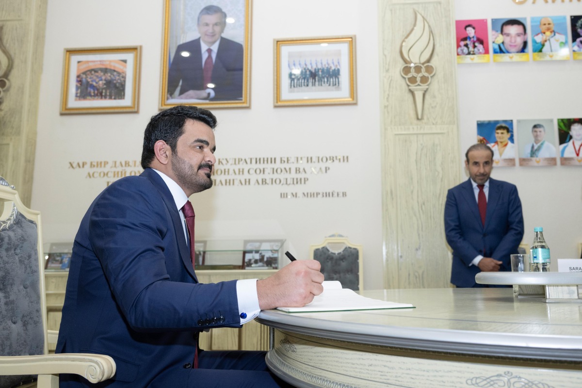 Upon his arrival, Sheikh Joaan visited the headquarters of the Uzbekistan National Olympic Committee, where he held a meeting with the senior sports officials who had welcomed him, along with President of the Uzbekistan Swimming Federation Qudratilla Rafikov. The meeting highlighted Uzbekistan’s impressive progress since its debut at the Barcelona 1992 Olympic Games, culminating in its record breaking participation at the Paris 2024 Olympic Games. Discussions also reviewed the country's sports infrastructure development plans and future projects, with special focus on the newly completed "Olympic City," which stands as a major hub for investment in Uzbekistan’s sports sector and the empowerment of youth.