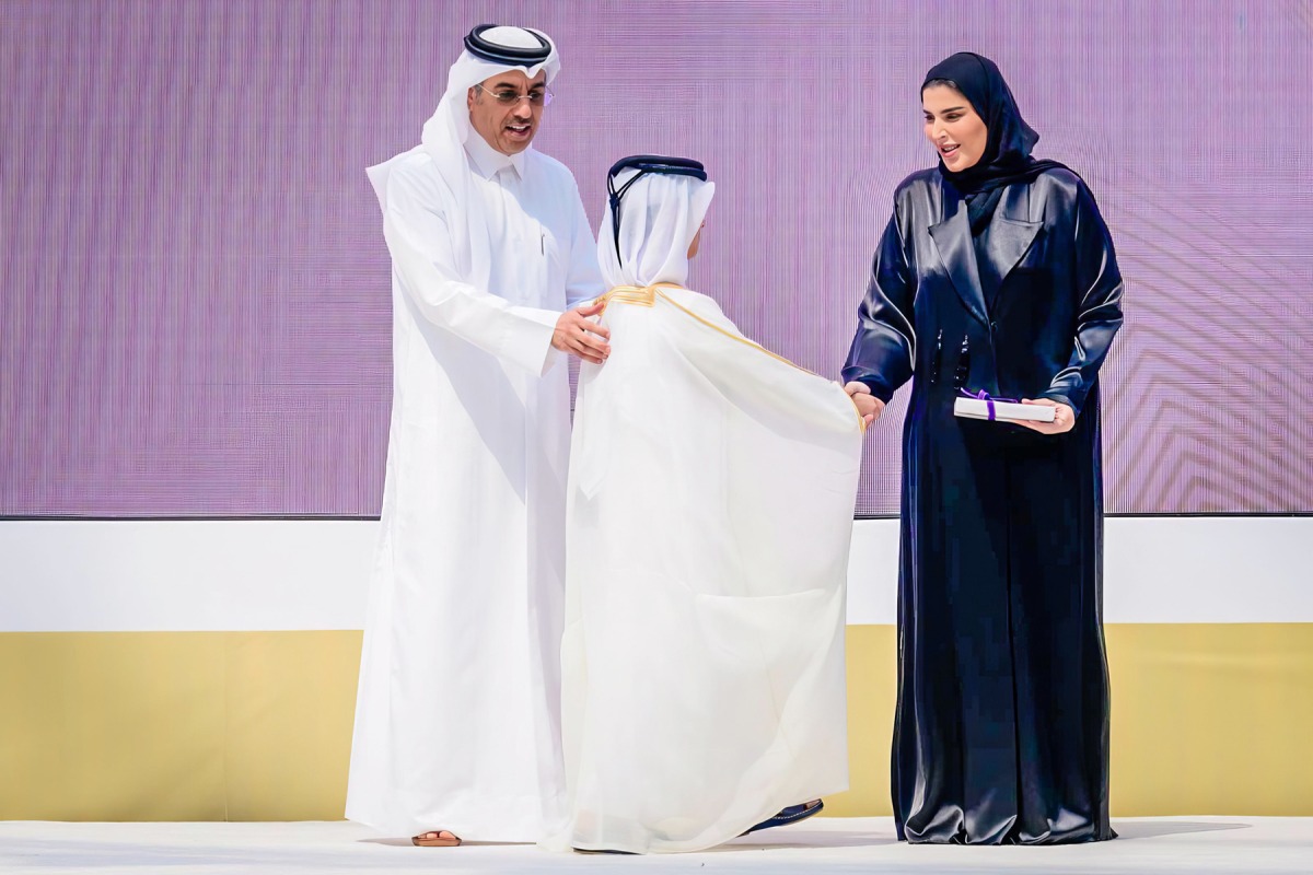 Minister of Labour H E Dr. Ali bin Smaikh Al Marri (left), and Minister of Social Development and Family H E Maryam bint Ali bin Nasser Al Misnad honouring a student at the event.