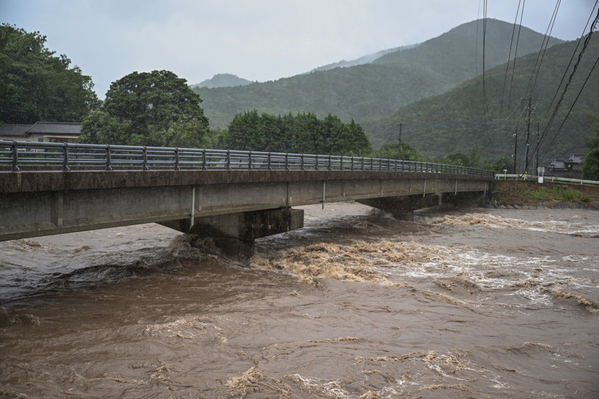 A general view shows the swollen Tsubusa river due to heavy rain brought by Typhoon Shanshan in Usa, Oita prefecture on August 29, 2024. Photo by Yuichi YAMAZAKI / AFP