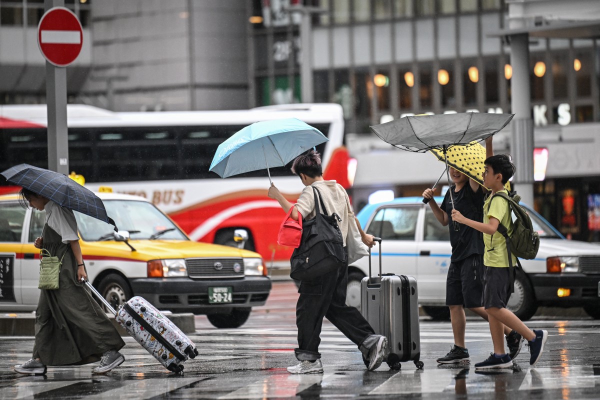 People hold umbrellas as they cross a street outside Hakata station in Fukuoka, Japan, on August 29, 2024. Photo by Yuichi YAMAZAKI / AFP