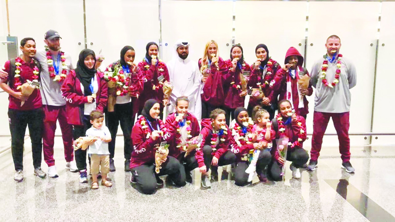 RIGHT: The Qatari handball team, which also secured a gold medal in the event pose for a group photo at the airport. Both the squads received a rousing welcome on homecoming, with Qatar Olympic Committee officials besides families, friends and fans greeting the victorious players.