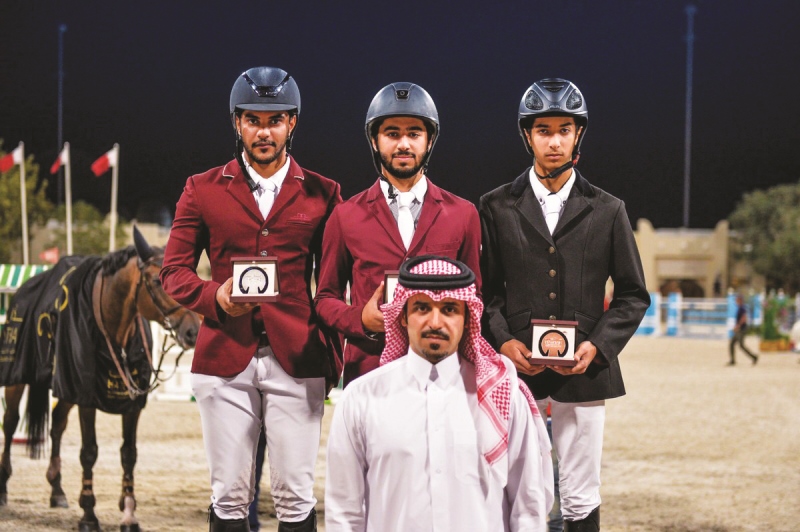 The podium winners of the Small Tour pose for a photograph during the presentation ceremony at the At the Qatar Equestrian Federation’s (QEF) Outdoor Arena.