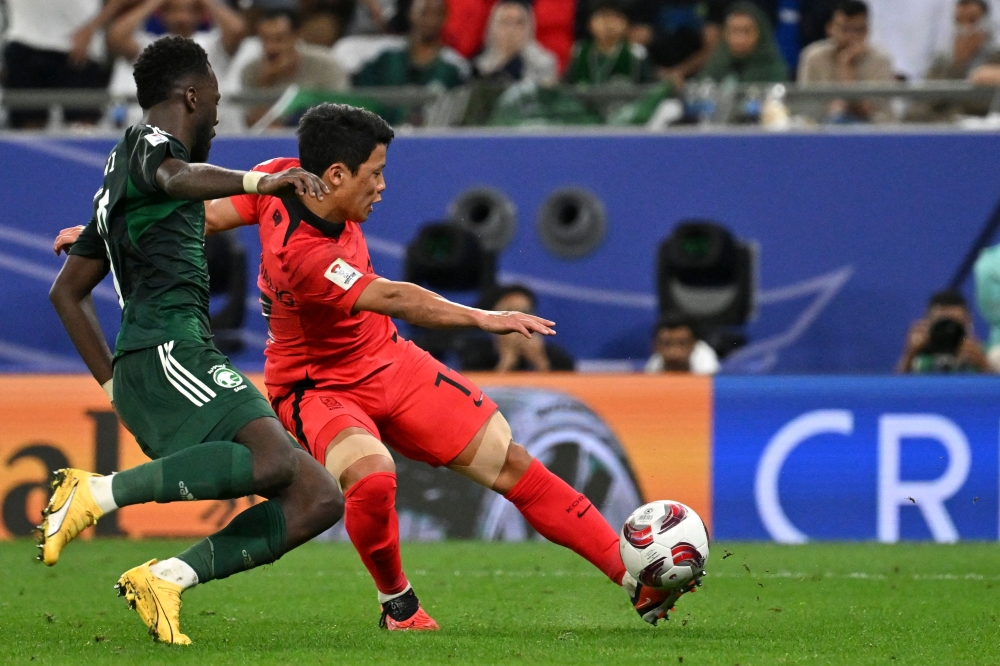 South Korea's midfielder #11 Hwang Hee-chan controls the ball past Saudi Arabia's defender #17 Hassan al-Tambakti during the Qatar 2023 AFC Asian Cup football match between Saudi Arabia and South Korea at Education City Stadium in al-Rayyan, west of Doha, on January 30, 2024. (Photo by HECTOR RETAMAL / AFP)