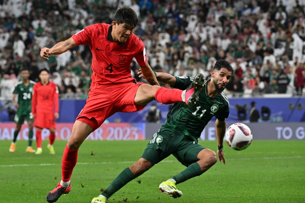 South Korea's defender #04 Kim Min-jae shoots the ball past Saudi Arabia's forward #11 Saleh al-Shehri uring the Qatar 2023 AFC Asian Cup football match between Saudi Arabia and South Korea at Education City Stadium in al-Rayyan, west of Doha, on January 30, 2024. (Photo by Hector RETAMAL / AFP)