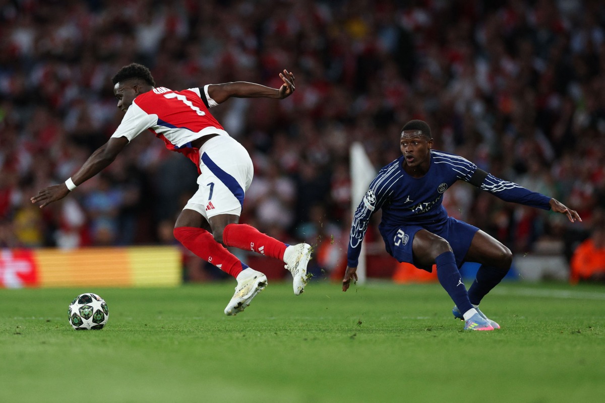 Arsenal's English midfielder #07 Bukayo Saka (L) controls the ball past Paris Saint-Germain's Portuguese defender #25 Nuno Mendes during the UEFA Champions League Semi-final First Leg football match between Arsenal and Paris Saint-Germain (PSG) at the Emirates Stadium in north London, on April 29, 2025. (Photo by Adrian Dennis / AFP)