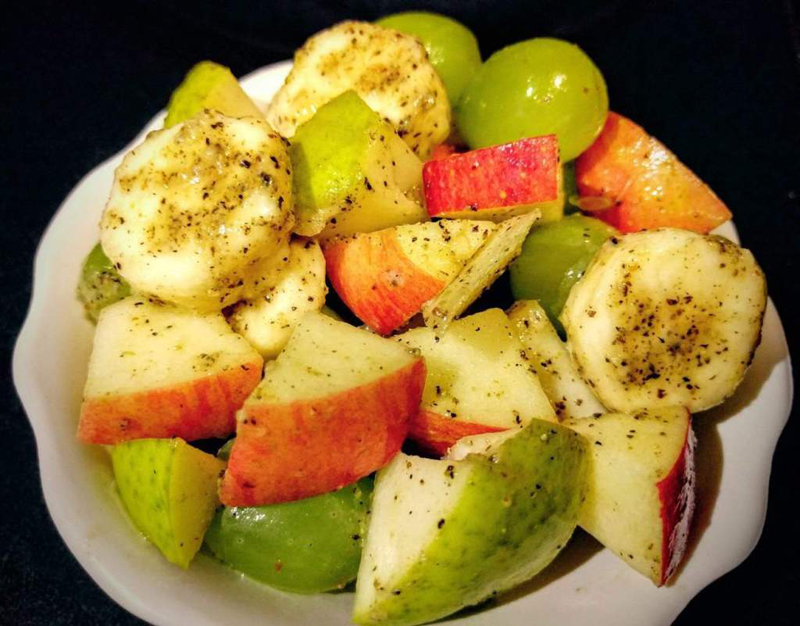Mix the fruits in a bowl and add 1/2 tsp rock salt, 1/ tsp black pepper powder, 1/2 tsp chaat masala and1/2 tsp roasted cumin powder. Also, sprinkle 1 tsp lemon juice.