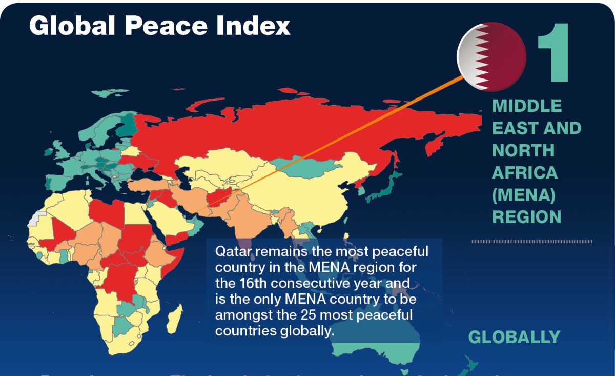 Last year, the Global Peace Index ranked Qatar as the most peaceful country in the Middle East and North Africa (MENA) region and out of the 163 countries, Qatar ranked the 23rd most peaceful country in the world.