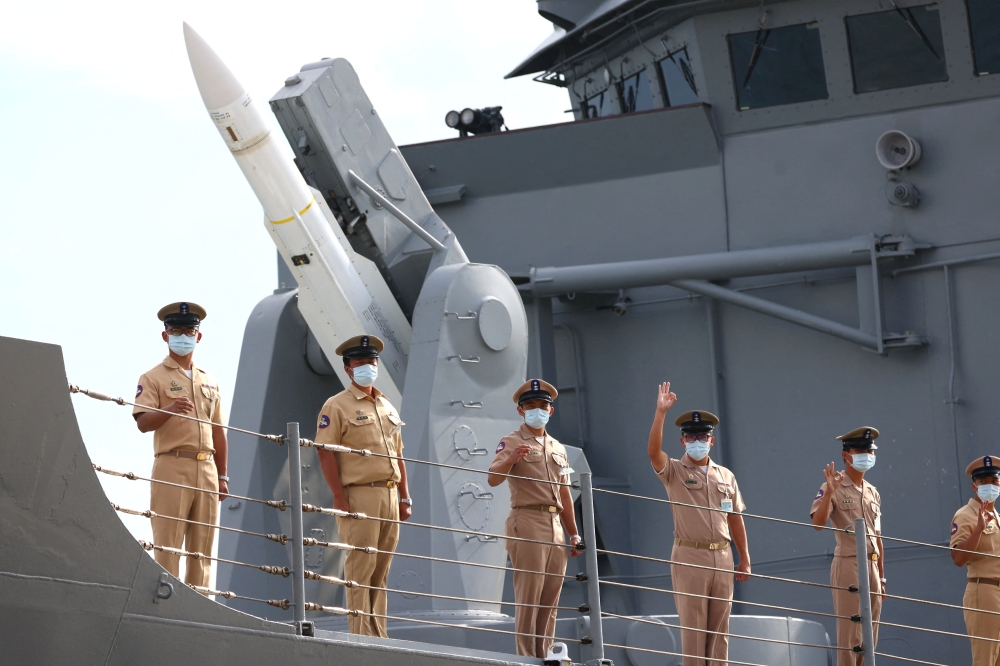 Members of the navy stand in front of a US-made missile on a frigate at a navy base in Penghu Islands, Taiwan, August 30, 2022. (REUTERS/Ann Wang)