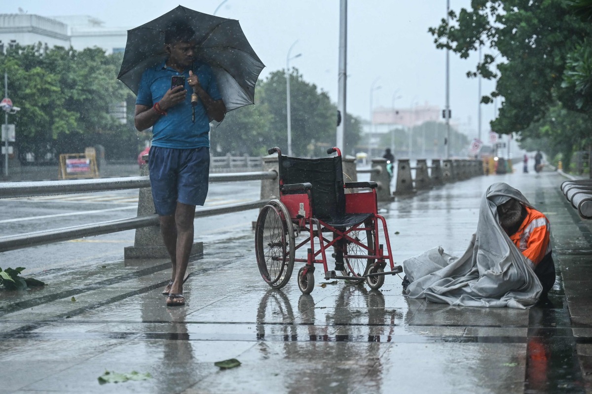A physically challenged man sits on a footpath amid heavy rainfall in Chennai on November 30, 2024, ahead of the landfall of cyclone Fengal in India's state of Tamil Nadu. (Photo by R.Satish BABU / AFP)