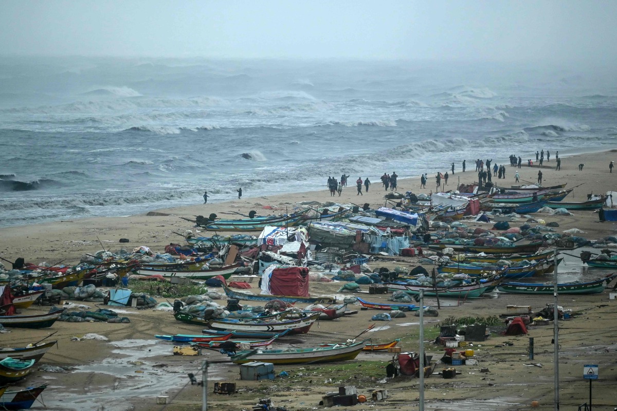 People gathered at the Marina Beach amid heavy wind and rainfall in Chennai on November 30, 2024, ahead of the landfall of cyclone Fengal in India's state of Tamil Nadu. (Photo by R.Satish BABU / AFP)