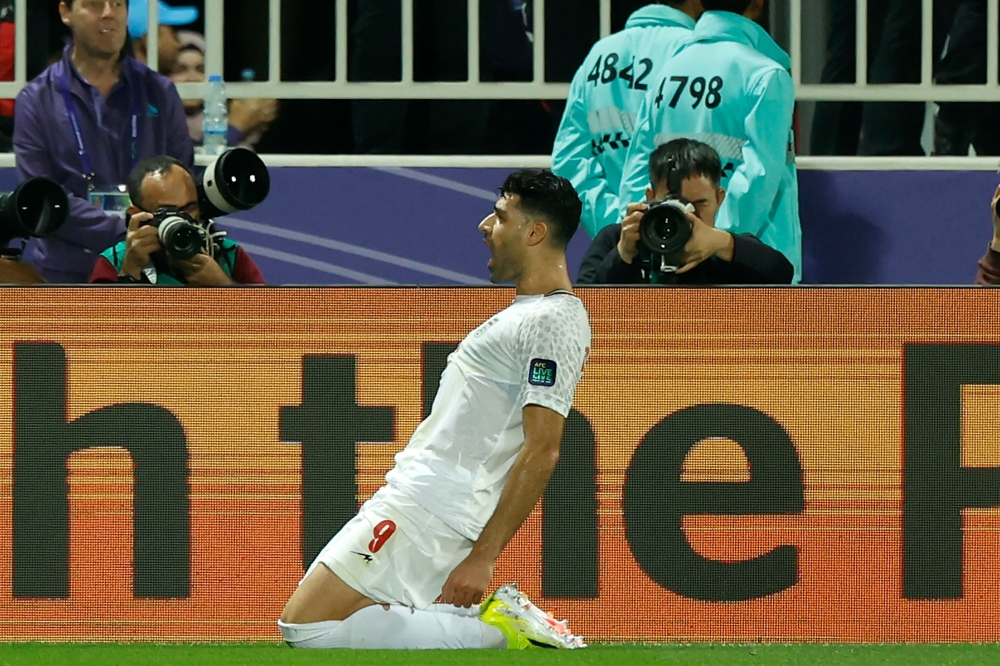 Iran's forward #09 Mehdi Taremi celebrates after scoring his team's first goal from the penalty spot during the Qatar 2023 AFC Asian Cup football match between Iran and Syria at the Abdullah bin Khalifa Stadium in Doha on January 31, 2024. (Photo by Karim Jaafar / AFP)