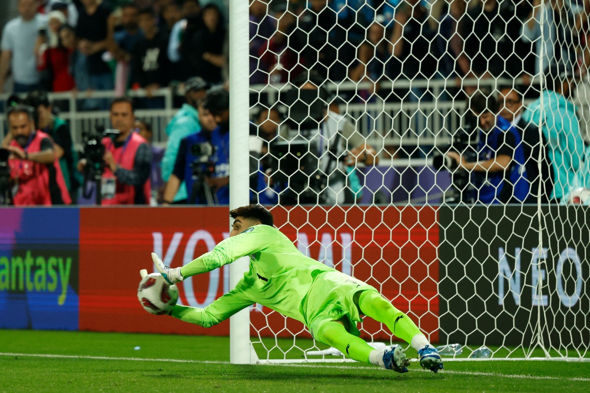 Iran’s goalkeeper Alireza Beiranvand saves a penalty. AFP