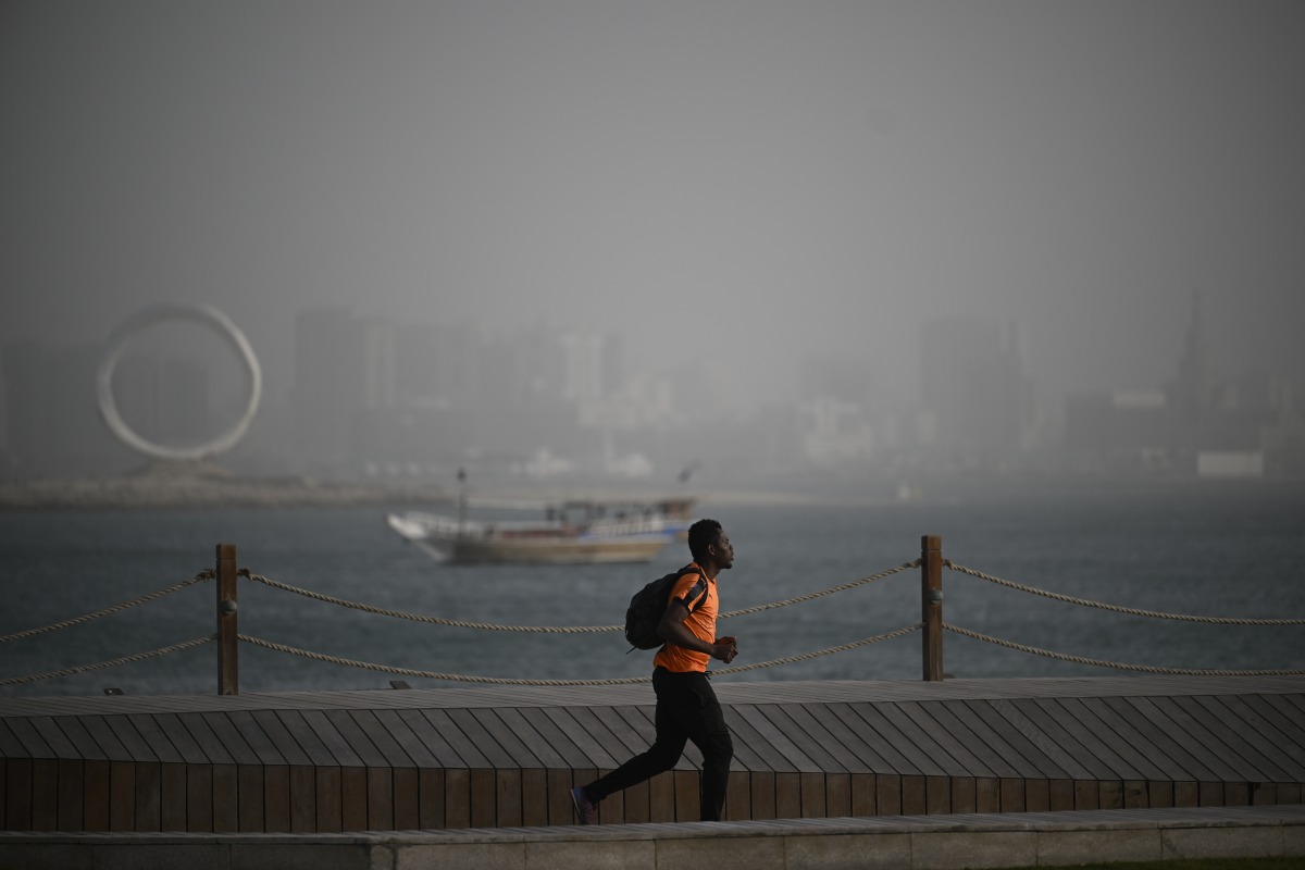 A man runs at the beach during a dust storm in Qatar's capital Doha, on January 25, 2026. (Photo by Mahmud HAMS / AFP)