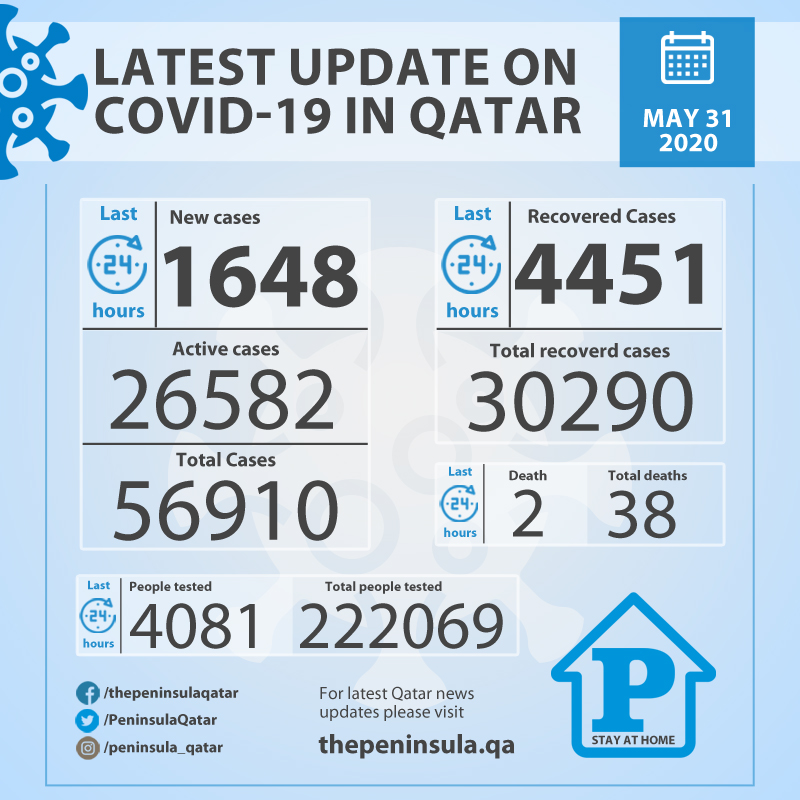 Ministry of Public Health today announced 1,648 new confirmed cases of COVID-19, with 4,451 people having recovered from the virus in the last 24 hours, bringing the total number of recovered people in Qatar to 30,290. The Ministry also announced two deaths due to the virus.