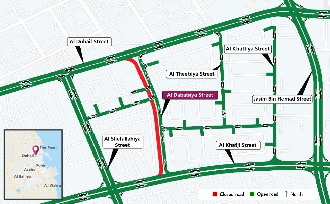 Al Dhabiya street in one direction from Al Duhail Street to Al Khafji Street, will close for 15 days, from Tuesday August 1 to Tuesday August 15 from 10:00pm to 5am.