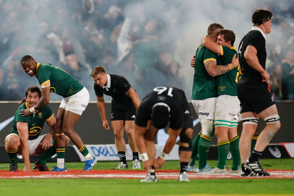 South Africa's loose forward Eben Etzebeth (L) and South Africa's full-back Aphelele Fassi (2nd L) celebrate after South Africa won the Rugby Championship Test match between South Africa and New Zealand at the Ellis Park Stadium in Johannesburg on August 31, 2024. (Photo by PHILL MAGAKOE / AFP)