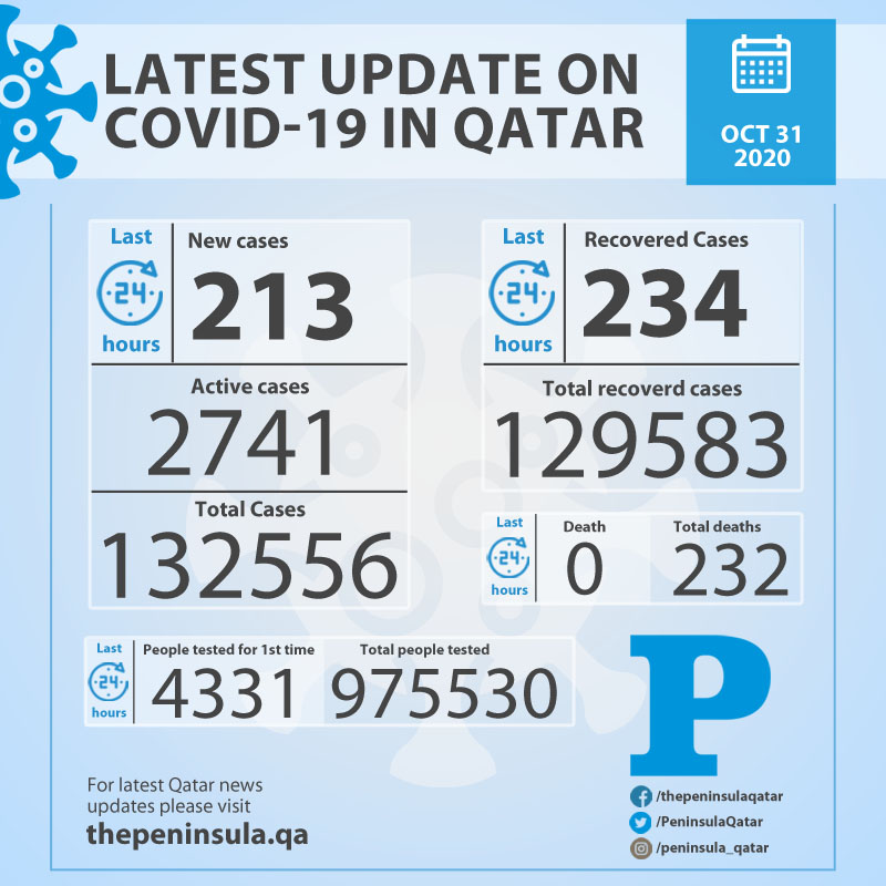 Doha: Ministry of Public Health (MoPH) today recorded 213 new cases of coronavirus (COVID-19) and 234 people recovered from the virus in the last 24 hours, bringing the total number of people recovered in Qatar to 129,583.
